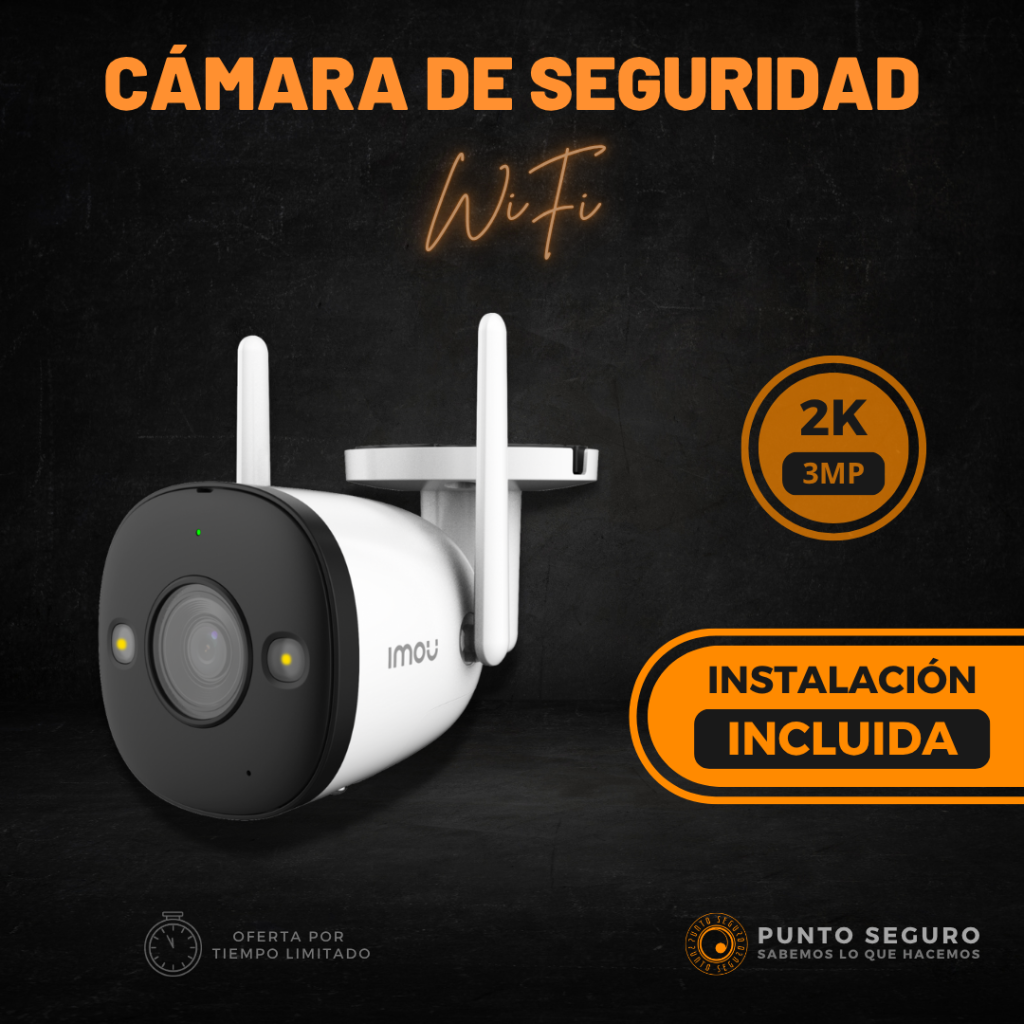 Cámara de seguridad Wi-Fi IMOU BULLET 2E de 3MP. Posee micrófono, detección de humanos, luces led, visión nocturna a color, resolución 3 Megapíxeles (mejor que FULL HD), apta uso en exteriores. ¡Instalación incluida!.