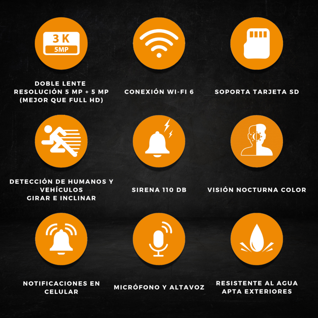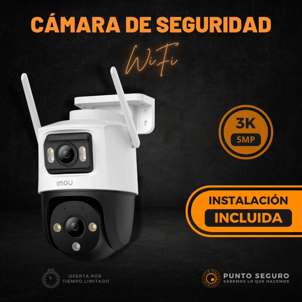 Cámara de seguridad Wi-Fi IMOU CRUISER DUAL de 10MP. Posee micrófono y altavoz, detección de humanos y vehículos, función de girar e inclinar con seguimiento inteligente, sirena, visión nocturna a color, doble lente, ambos con resolución 5 Megapíxeles (mejor que FULL HD), apta uso en exteriores. ¡Instalación incluida!.